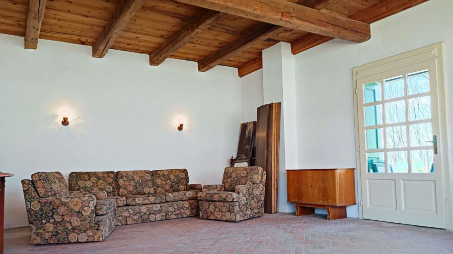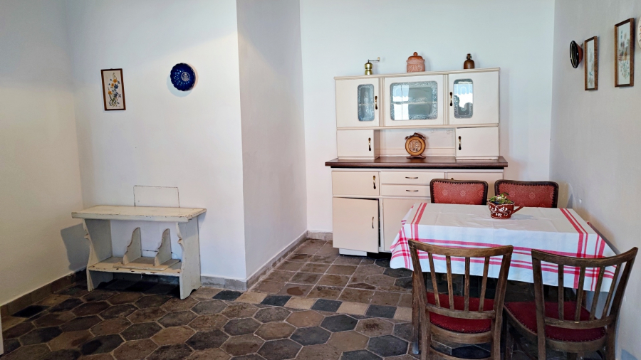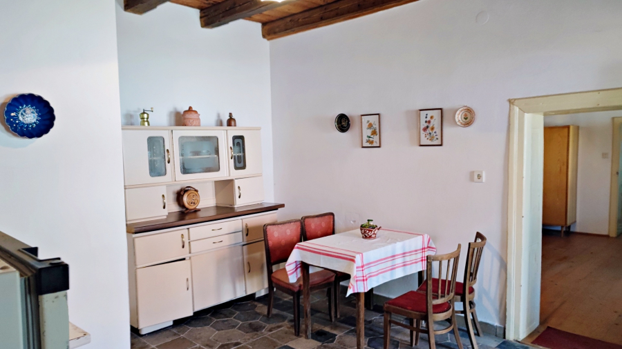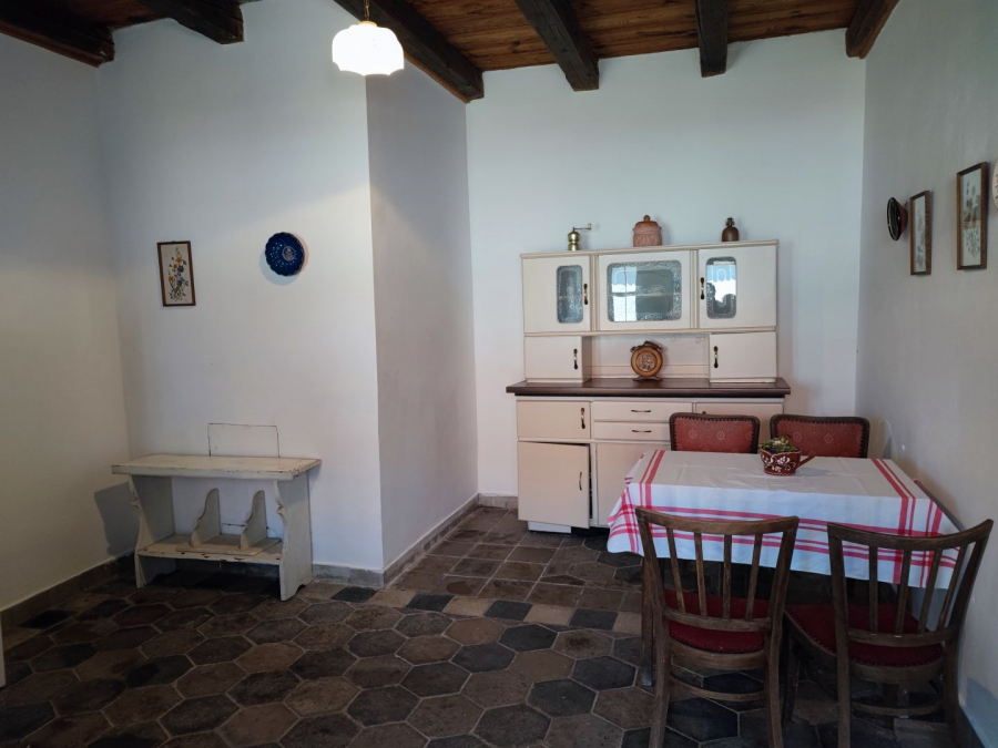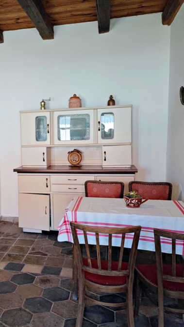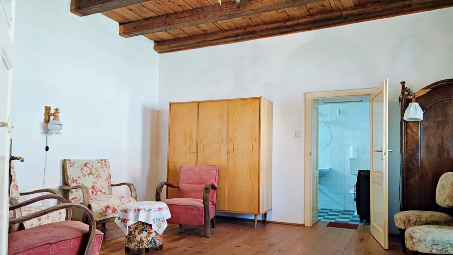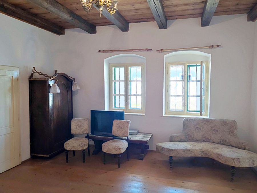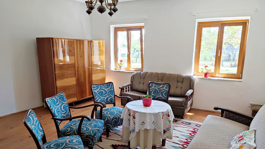 Vanaf de veranda bereiken we de keuken (18 m2), van waaruit we de kamers rechts en links vinden (27m2, 21 m2). Vanuit een van de kamers komen we in de badkamer (9 m2). De woon-/zitruimte van 42 m2 is toegankelijk via een aparte ingang. De ruime plafond hoogte van het huis doet denken aan een stadswoning. De eigenaren hebben bijzondere zorg besteed aan het behouden van de sfeer van de jaren 1900. Dankzij de dikke muren is het klimaat van het gebouw in de zomer aangenaam koel en in de winter warm. Een airco is hier niet nodig! Het huis wordt verwarmd door houtkachels en een werkende oven in de keuken, waarboven een wierookbrander is opgesteld.